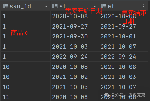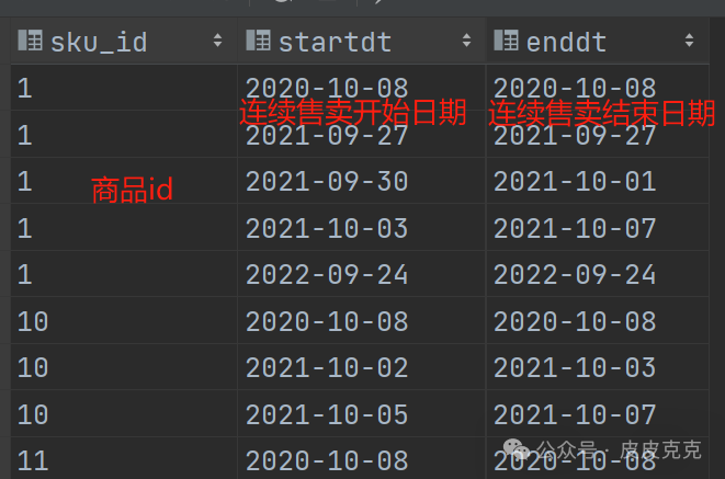 题目: 查询订单详情表order_detail中,商品连续售卖的时间区间。一、需求场景