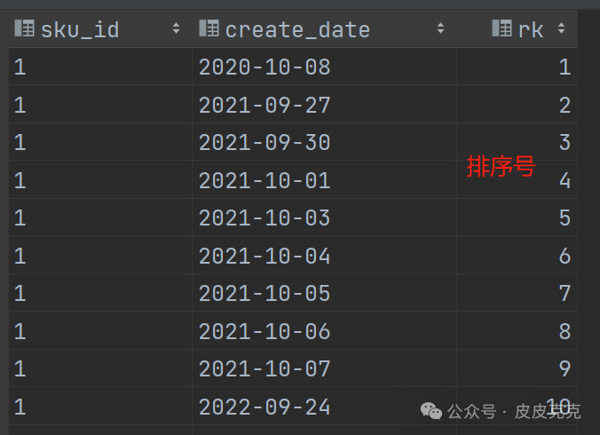 (3)如果存在连续日期,则连续的多个日期:create_date-rk 得出的结果一样。按照sku_id 和 这个差值分组即可