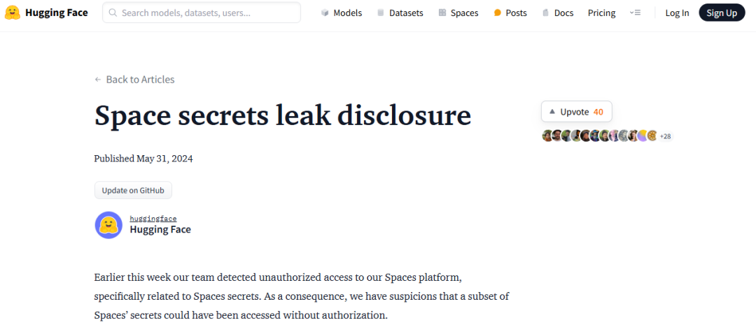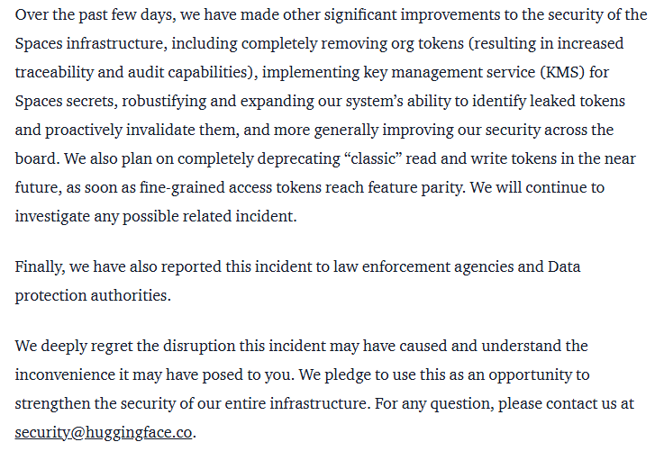 Hugging Face在其官网公告中警告说:“本周早些时候,我们的安全团队发现了对Spaces平台的未经授权访问,特别是与Spaces机密相关的访问。因此,我们怀疑Spaces的部分机密(即作为解锁如账户、工具和开发环境等受保护资源的关键私密信息)可能已被未经授权访问。”
