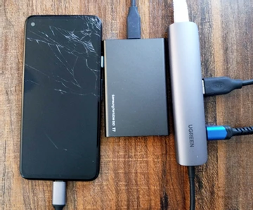 根据你的手机,可能需要支持 micro USB 或 USB-C。这个扩展坞应该至少有一个 USB 端口,可以连接到外部驱动器,而且还有一个充电的端口,但我建议选择一个带有以太网适配器的扩展坞。你可以通过 WiFi 运行该服务器,但以太网更快、更可靠。