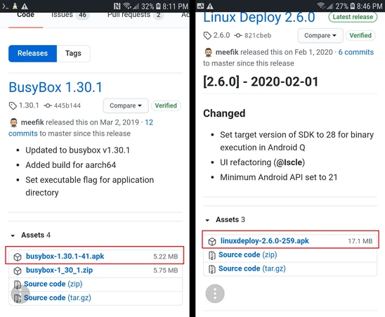 1-1. 在 root 完手机后,打开 GitHub,下载 Linux Deploy 和 BusyBox的 .apk 软件包,安装这两个应用。