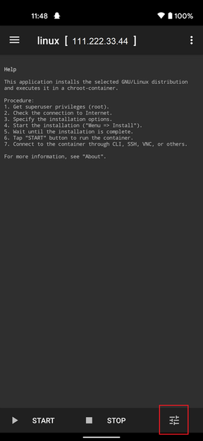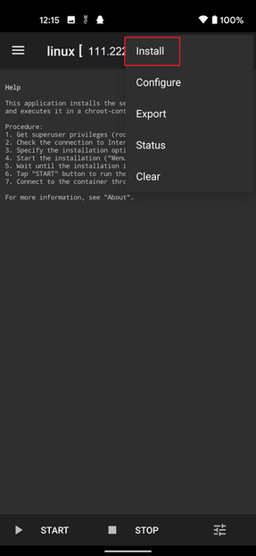 1-5. 返回首页,打开右上角的菜单。点击 “Install”(安装)。你将看到安装的实时日志。完成后,日志将以 “deploy”结尾。 选择屏幕左下角的 “START”(开始)。Android 手机上就开始运行 Debian 服务器了!