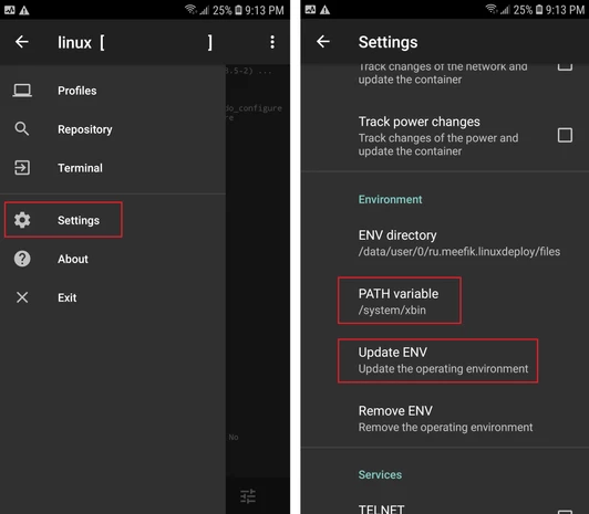 1-4. 回到首页,并打开左上角的菜单。选择 “Settings”(设置),并一直向下滚动到 “PATH variable”(路径变量)。这就是你安装 BusyBox 的位置。设置好 “PATH variable” 后,选择 “Update ENV”(更新环境变量)。