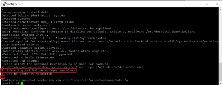 在安装过程中,脚本会要求你选择快照机制。对于“LVM – Logical Volume Manager snapshots”,请输入“2”: