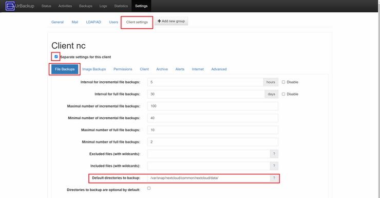 在“Settings”页面上,点击“”Client settings(客户端设置)。选中“Separate settings for this client”,在“File Backups”下的“Default directories to backup”中设置你想备份的目录。如果想添加多个目录,可以用分号“;”分隔。