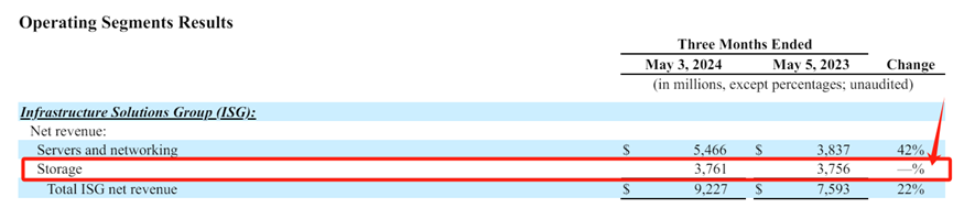 根据公司披露的数据,AI服务器业务从0增长到17亿美元,而传统服务器、存储服务器与上一季度业绩持平。