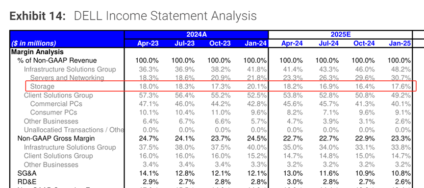 此外,AI服务器供应链显示,HBM和DDR存储器受AI催化供应紧俏,而Dell在这一波存储出货潮下,营收也没有见到明显的变化。