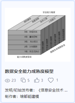 DSMM(Data security capability maturity model)数据安全能力成熟度模型,由阿里巴巴作为主要起草单位编制的一份关于数据安全管理的标准。DSMM借鉴能力成熟度模型(CMM)的思想,将数据按照其生命周期分阶段采用不同的能力评估等级,分为数据采集安全、数据传输安全、数据存储安全、数据处理安全、数据交换安全、数据销毁安全六个阶段。DSMM从组织建设、制度流程、技术工具、人员能力四个安全能力维度的建设进行综合考量。DSMM划分成了1-5个等级,依次为非正式执行级、计划跟踪级、充分定义级、量化控制级、持续优化级,形成一个三维立体模型,全方面对数据安全进行能力建设。