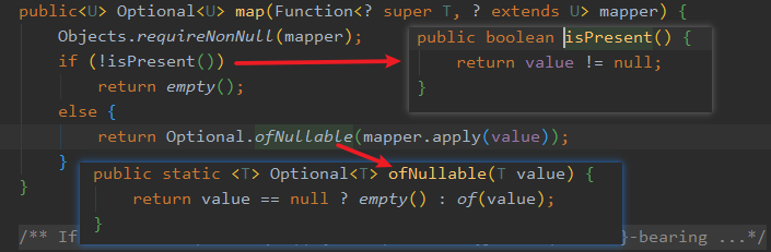 如果 value 不为空,那说明值是存在的,因此调用 mapper (就是上面我们写的 a.getAddress 之类的)来操作一波这个 value,并且用 Optional.ofNullable 包了一层,这个方法内部也看到了,如果 value 是空的话,也是返回空 Optional,否则就利用 of 包裹 value 成 Optional 返回。