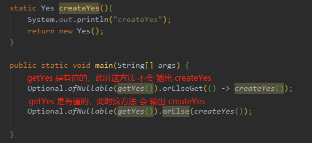 因此 orElse(createYes()) 会被执行,在参数入栈之前,执行了 createYes 方法得到结果,然后入栈,而 orElseGet 的参数是 Supplier,所以直接入栈,然后在调用 other.get 的时候,createYes 方法才会被触发执行,这就是两者的区别之处。