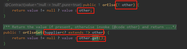 可以看到两者的入参不同,一个就是普通参数,一个是 Supplier。我们已经得知不论Optional.ofNullable 返回的是否是空 Optional,下面的逻辑还是会执行,所以 orElse 和 orElseGet 这两个方法无论如何都会执行。