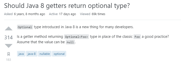 Brian Goetz 给了回答,我直接翻译了:你可能永远不应该将它用于返回结果数组或结果列表的内容,而应该返回空数组或空列表。你几乎不应该将它用作某个字段或方法参数,我认为经常使用它作为 getters 的返回值肯定是过度使用。