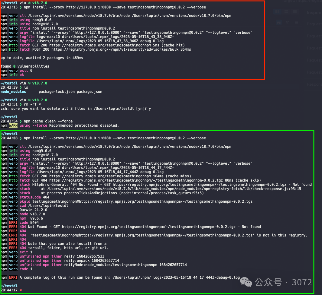 虽然这次攻击是直接从Burp Suite测试的,我们已经创建了一个虚拟包来测试我们是否能够从npm install命令中投毒。我们对npm cli进行了代理,以查看发生了什么,然后从当前系统中清除了缓存。在循环运行攻击几秒钟后,我们设法确认我们能够在包上传后在生产环境中对包进行CPDoS: