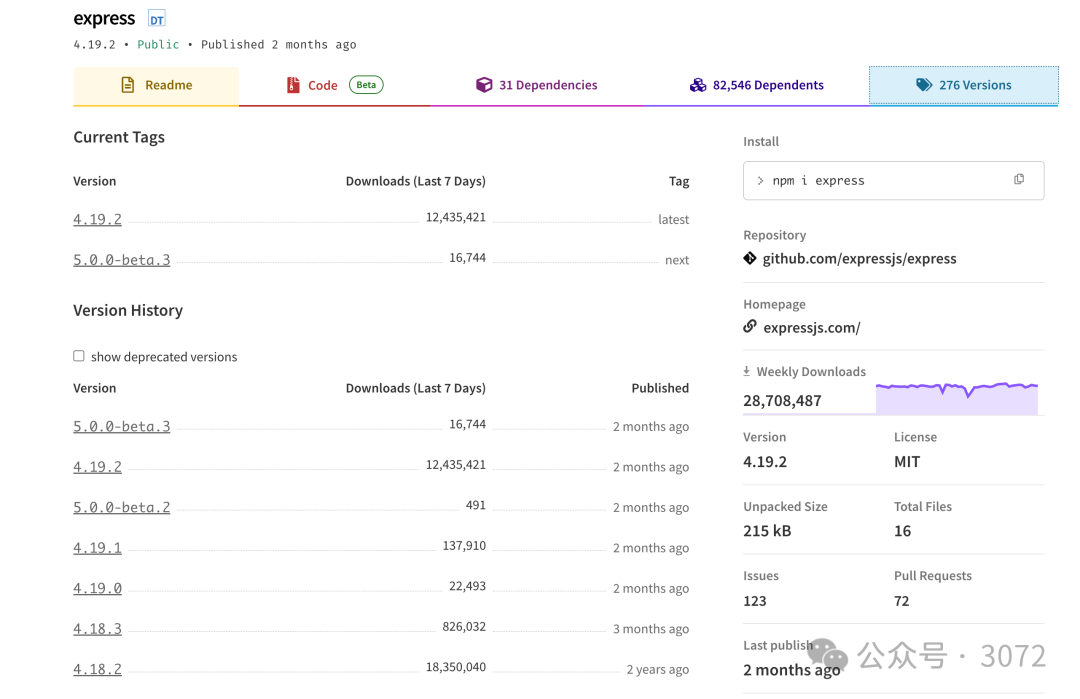 考虑这样一个场景,一个广泛使用的包,如express被攻击者针对。它在其最新版本上每周有超过1200万次下载,这个包是无数Web应用程序的基本构建块。