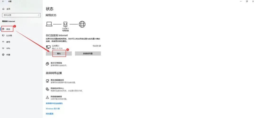 第2步:在设置窗口中,点击“状态”下的“查看网络属性”【网络属性中包含了当前网络连接的各种信息,其中就包括我们需要的IP地址】。
