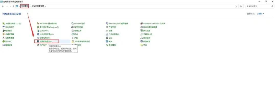 第1步:在Windows搜索栏中输入“控制面板”打开,然后点击“网络和共享中心”。