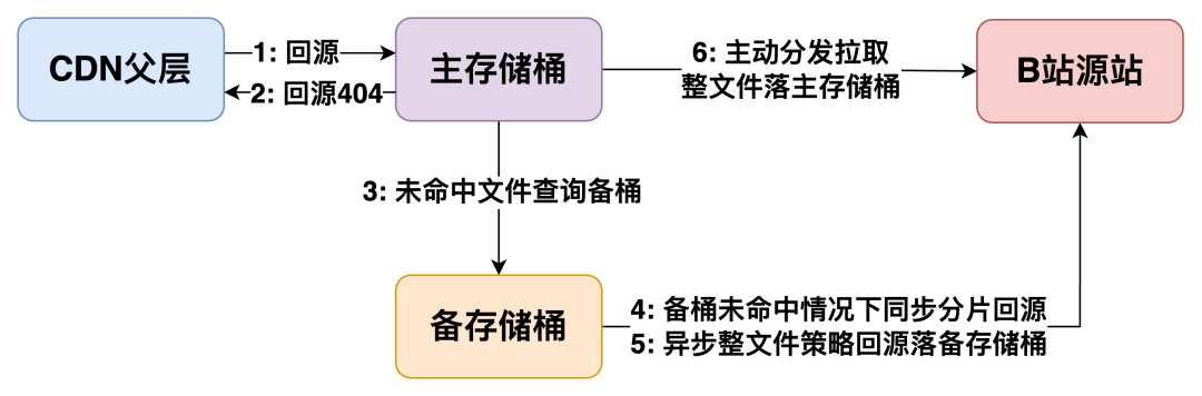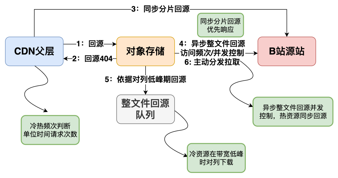 在分析了厂商回源架构后,基于公司的点播业务特性提出了一个回源标准化方案,主要的逻辑如下: 首先让同步分片回源优先响应,降低用户播放延迟 其次根据分片回源请求的频次统计,对视频文件的冷热进行判断 判定为热文件时,整文件同步拉取,以此来降低这部分热资源分片再次请求时的回源带宽 判定为冷文件的情况下,放入整文件回源对列,等待流量低峰时错峰下载落存储,避免流量高峰时段影响源站 然后对整文件下载的逻辑进行流控限速,避免大幅放大回源带宽 最后在极端情况专线中断时,停止异步整文件回源和主动分发拉取,保障用户同步分片回源正常走公网,降低业务影响