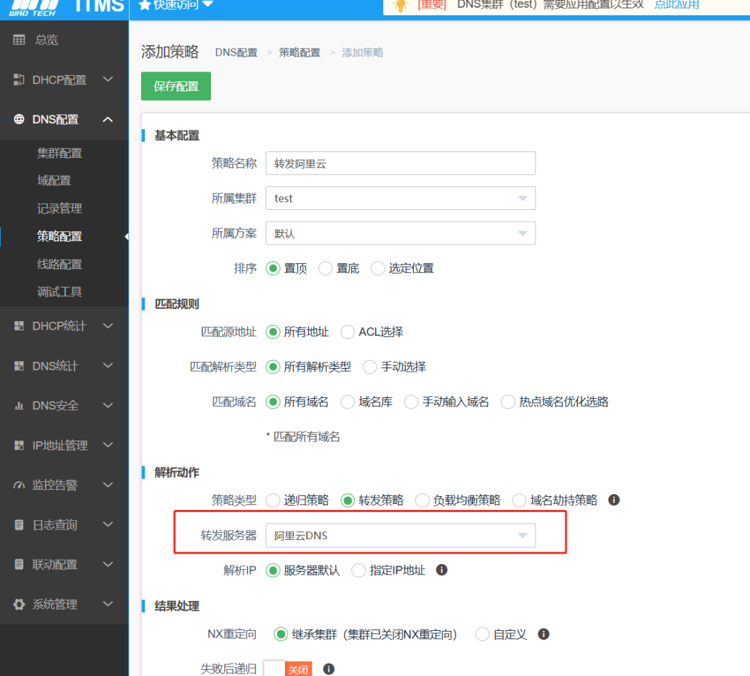 检查“策略配置”和“集群配置”,是否有转发到阿里云DNS的配置,如果有,可以将其解析动作修改为递归策略或者转发到其他公共DNS上。