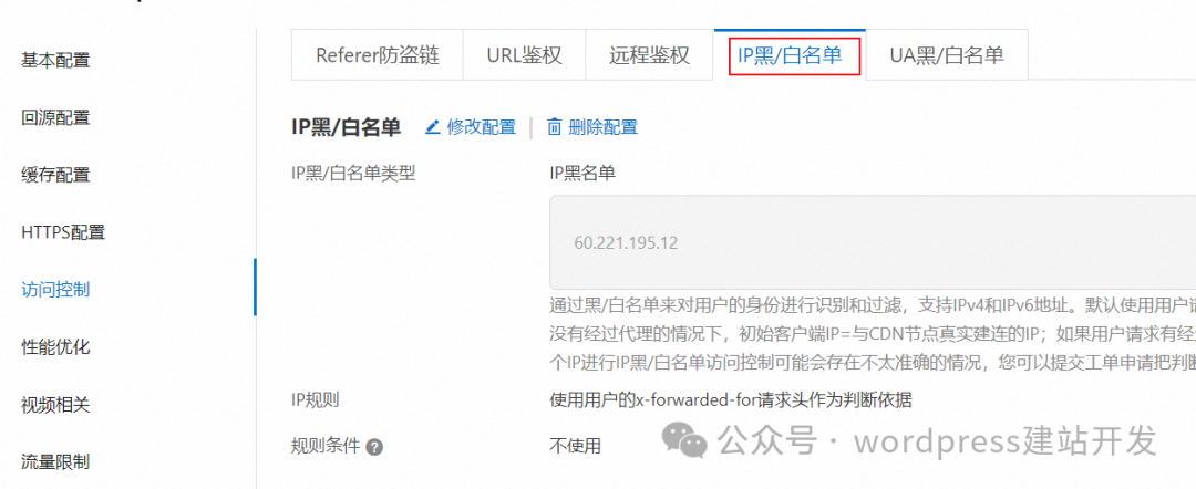 接下来做一些简单处理。进入CDN设置,访问控制中,把查到的IP地址添加到黑名单。添加之后暂时清静了,截止目前发现还算正常。