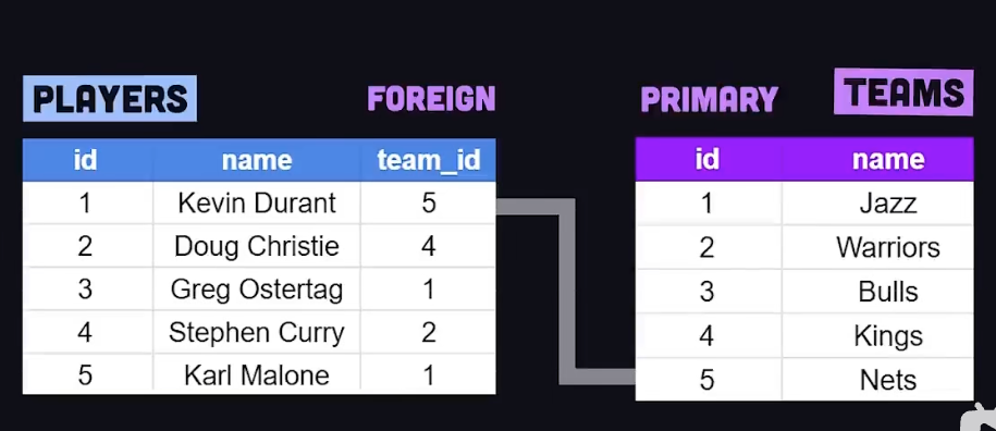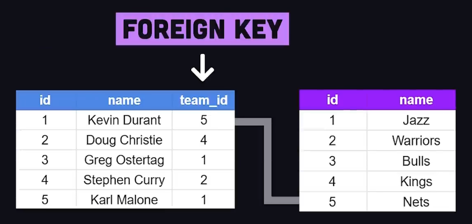 我们可以通过从一行获取唯一 ID,并将其存储在不同表的不同行中称为外键的特殊列中来建立数据点之间的关系。