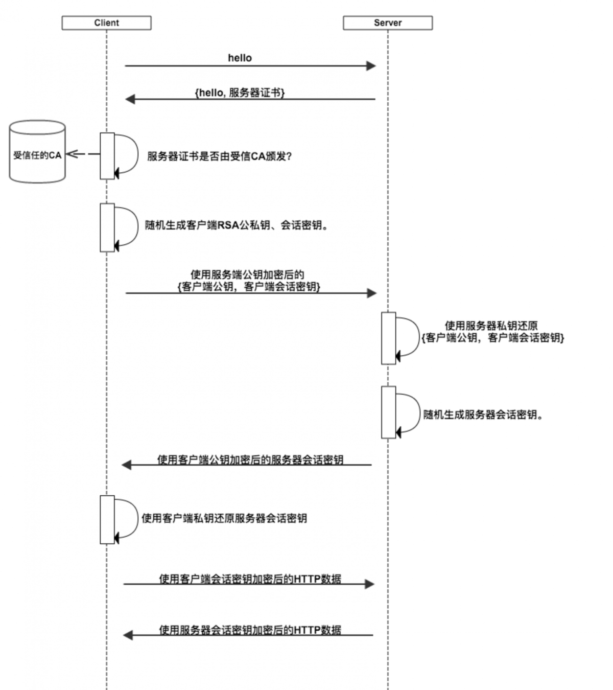 加密通讯。此时客户端服务器双方都有了本次通讯的会话密钥,之后传输的所有Http数据,都通过会话密钥加密。这样网路上的其它用户,将很难窃取和篡改客户端和服务端之间传输的数据,从而保证了数据的私密性和完整性。
