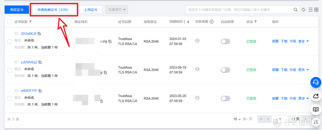 然后点击我们刚刚添加的免费域名后面的“SSL”标识。