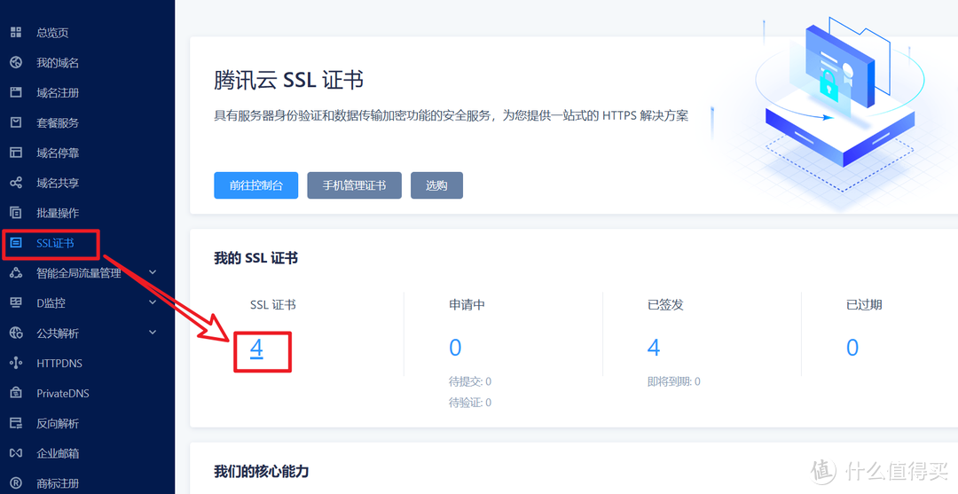 当我们收到证书审核通过的信息以后,回到DNSPOD管理控制台,点击左侧的“SSL证书”,在“我的SSL证书”下面就能看到签发过来的证书了(请忽视我之前申请过的证书数量)。