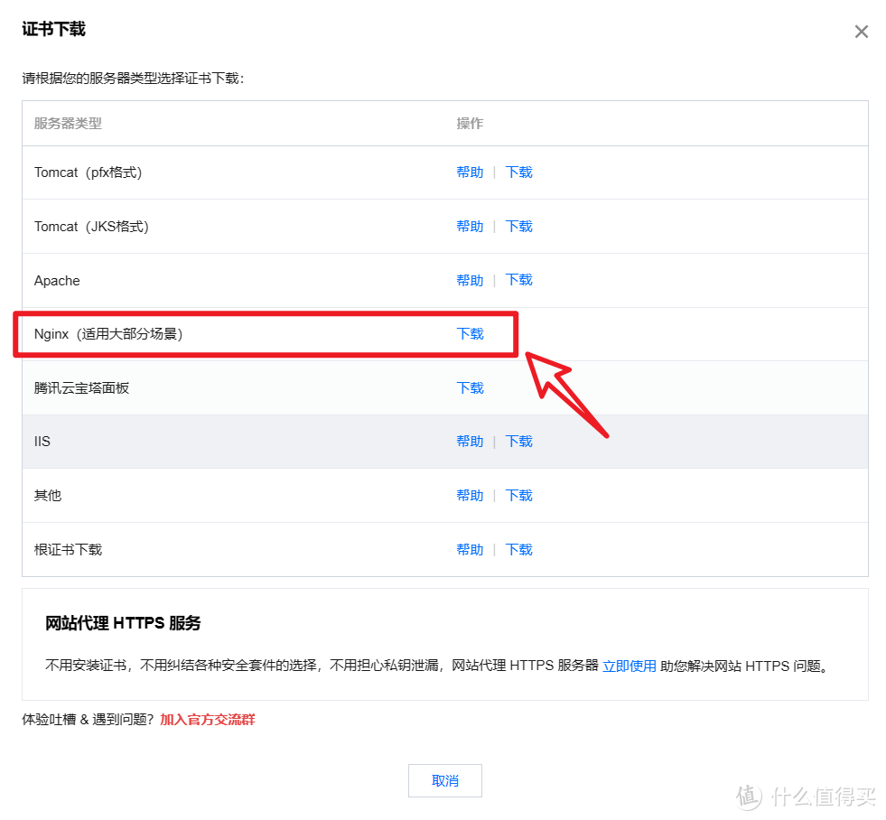 类型选择“Nginx”,然后点击后面的“下载”按钮。