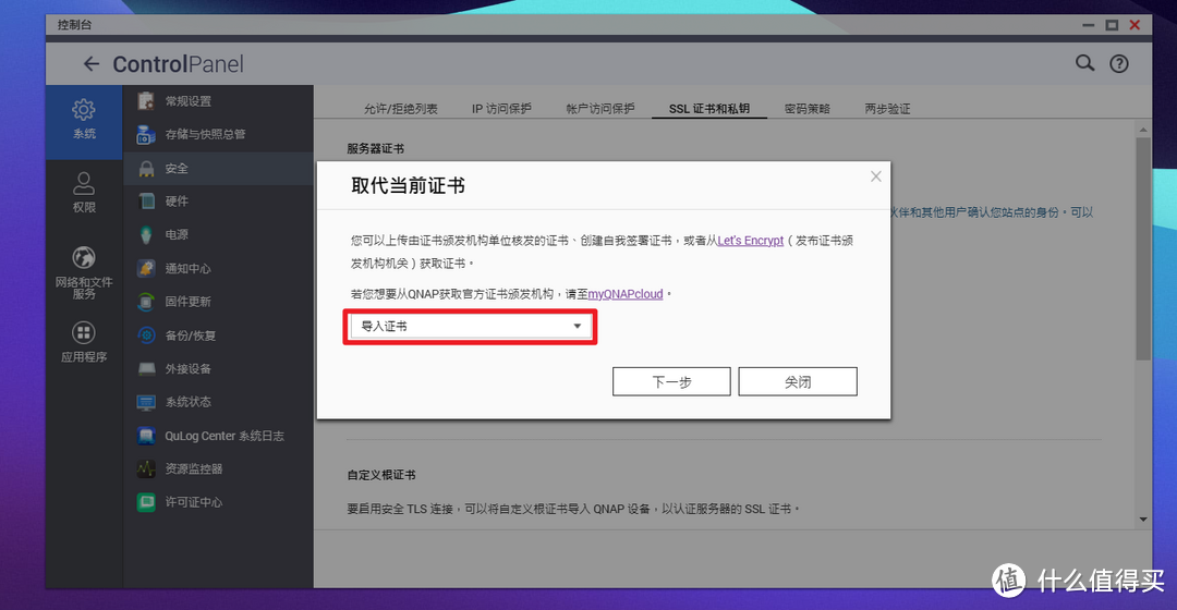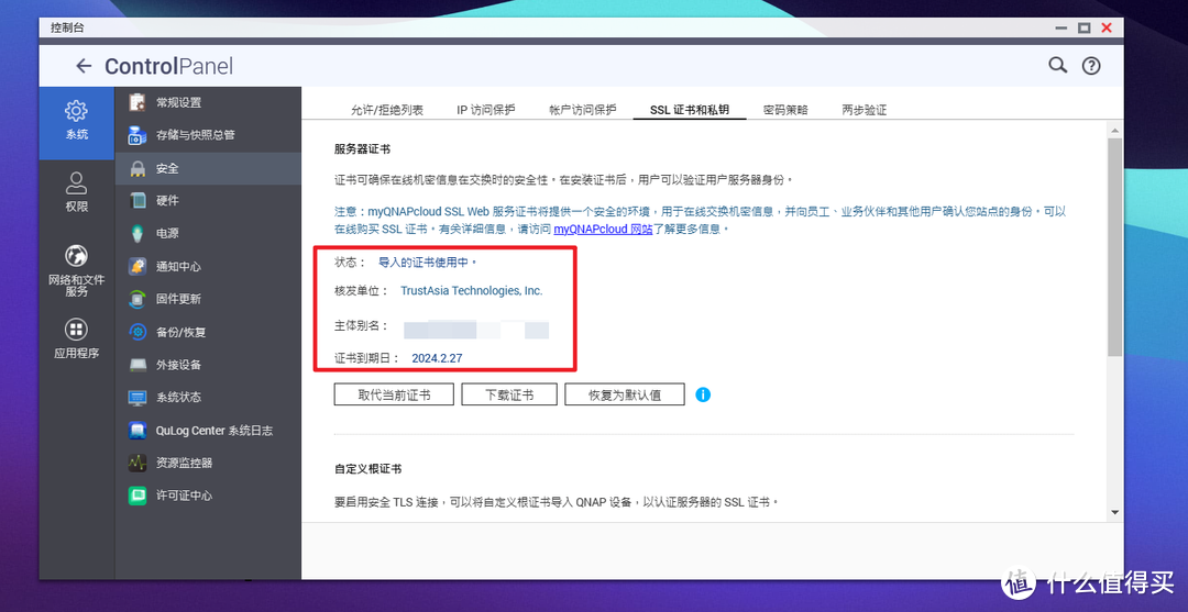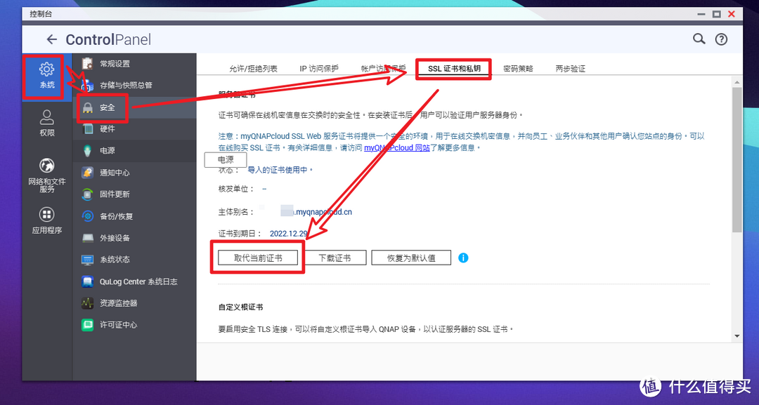进入威联通【控制台→系统→安全→SSL证书和秘钥】,点击“取代当前证书”。