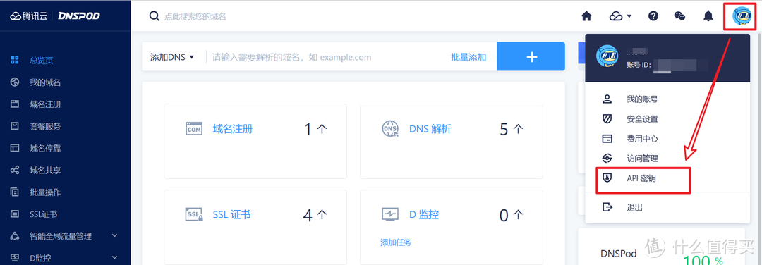 在NAS上Docker安装好『DDNS-GO』容器之后,先不用打开。继续回到腾讯云dnspod控制台页面,点击控制台右上角的头像,选择“API密钥”。