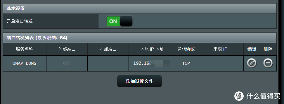 这里仅以华硕路由器为例,接着打开路由器后台,在“外部网络(WAN)”设置里,找到“端口转发”,添加一个TCP通信协议。外部端口就是NAS的HTTPS访问端口,本地IP地址就是NAS的局域网IP地址。完成之后点“确认”。