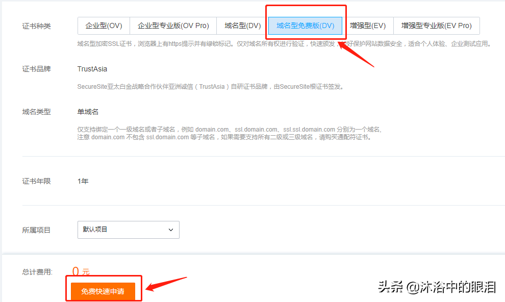选择【域名型免费版(DV)】,然后点击【快速免费申请】,进入到证书申请页面: