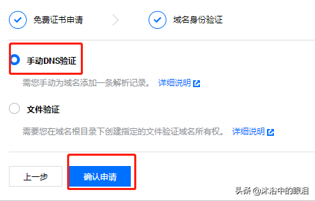 保留默认选择【手动DNS验证】,点击【确认申请】: