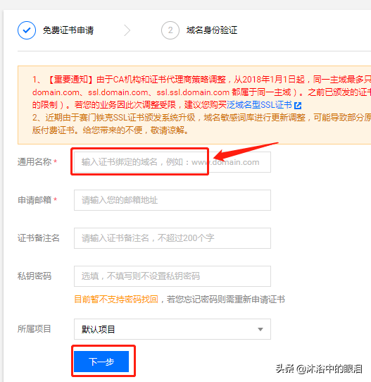 在【通用名称】输入完整的想要申请https域名的地址,如:api.**.**.com,点击【下一步】进入域名身份验证页面: