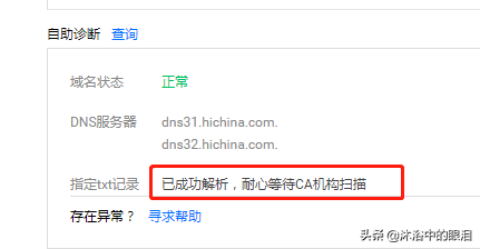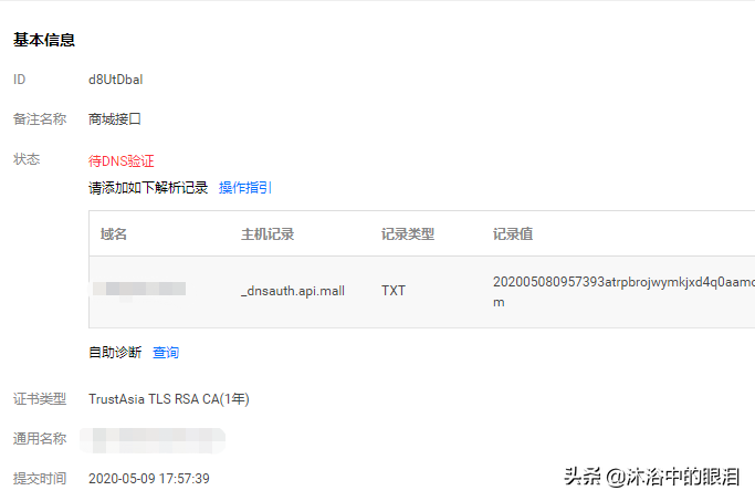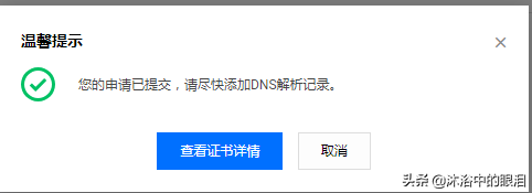 此时,我们距离证书申请成功还差最后一步,就是进行域名的解析,在域名解析中添加一条记录: