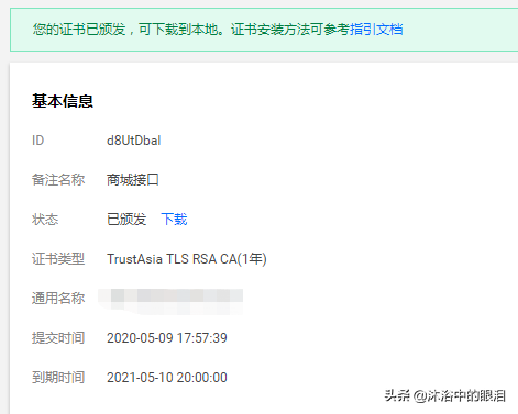 此时说明域名证书申请成功,点击【查看证书详情】,进入详情页面: