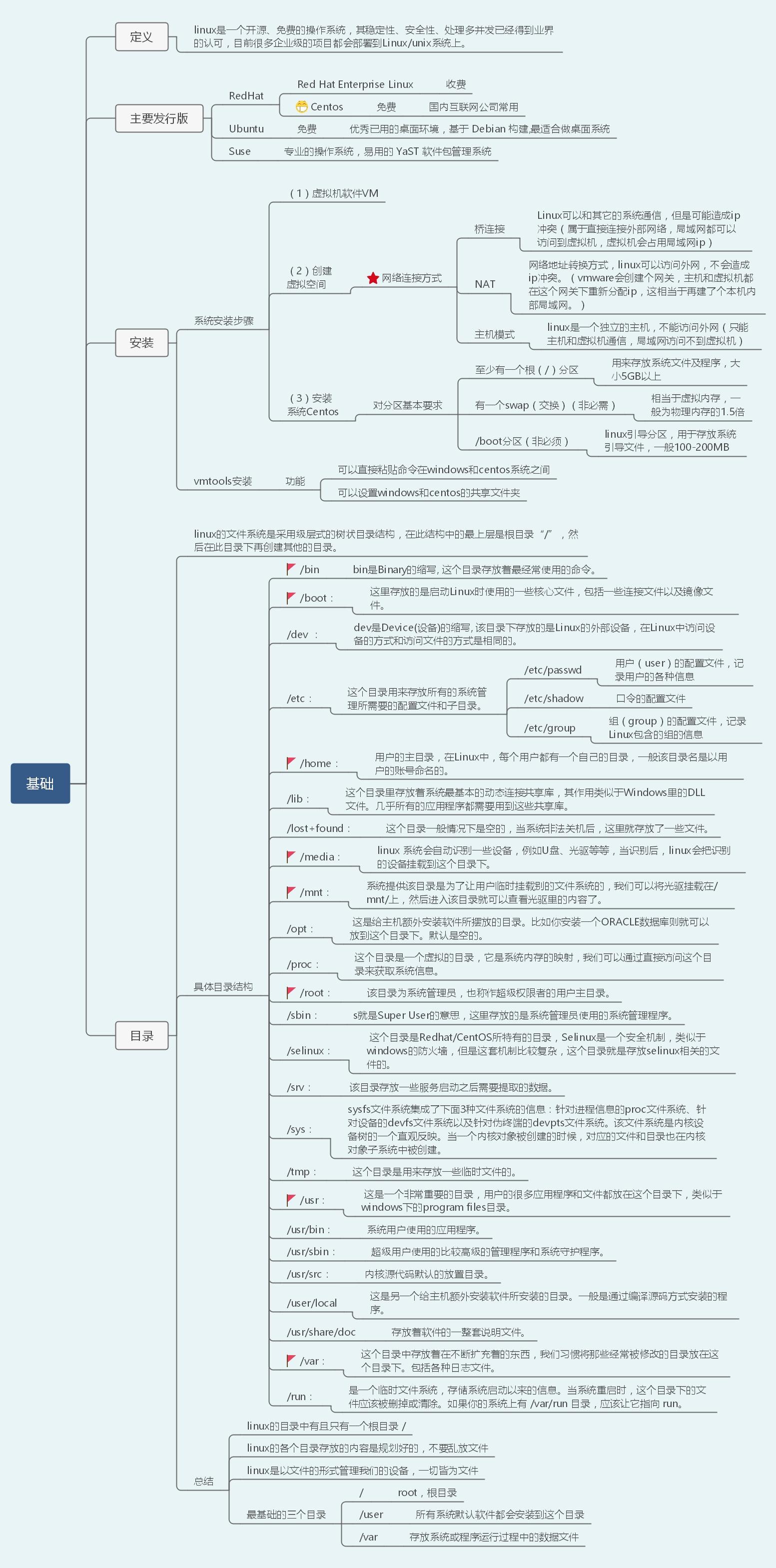 本文主要是Linux的入门内容,利用40张思维导图从基础、操作、实用指令、组管理和权限管理、crond任务调度、Linux磁盘分区和挂载、Linux网络环境配置、进程管理、服务管理、RPM和YUM、软件安装关键点、Shell编程共十二部分着手,从而系统的了解一下Linux(基于Centos),本文的定位是前端工程师够用、运维工程师入门。