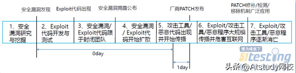 安全漏洞被发现到其消亡的过程被划分为7个步骤,其中包含的概念如下:
