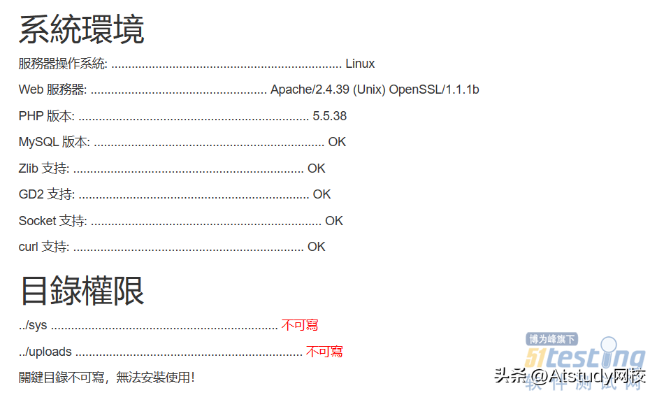 可以看出有两个目录没有写权限,需要sys和uploads进行赋权,在/www/admin/localhost_80/wwwroot下面执行下面的命令,这里只需要给other赋予写入权限即可。