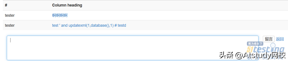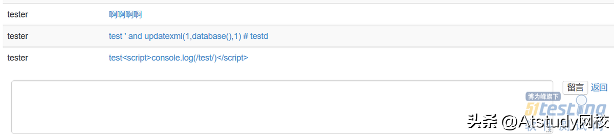 结果发现,注入的sql代码被原样显示,显然这里没有sql注入,那么再检测一下是否可以进行XSS,在输入框中输入以下代码test<script>console.log(/test/)</script>提交留言。