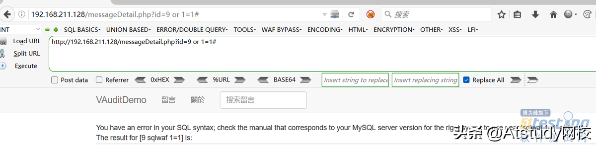 可以看出,还是被原文显示,说明这里漏洞也被堵了,那么点击查看留言详情试试,这里我们可以获得留言详情的接口地址:http://192.168.211.128/messageDetail.php?id=9这里参数id看起来应该是一个查询条件,那么可以尝试看看这里是否存在注入的可能。在hackbar中输入http://192.168.211.128/messageDetail.php?id=9 or 1=1#可以看到下图显示: