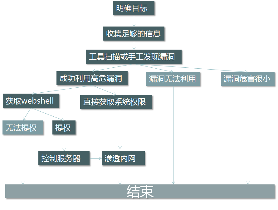 实施攻击:根据前几步的结果,进行攻击获取内部信息:基础设施(网络连接,VPN,路由,拓扑等)进一步渗透:内网入侵,敏感目标持续性存在:一般我们对客户做渗透不需要。rookit,后门,添加管理账号,驻扎手法等清理痕迹:清理相关日志(访问操作),上传文件等。