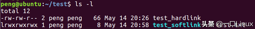 这里,test_softlink 就是一个链接文件,从结果上还可以看到它是文件 test.txt 的软链接,删除原文件 test.txt 的话,对应的软链接文件 test_softlink 也会消失。可以使用 ln 命令来创建一个文件的链接文件: