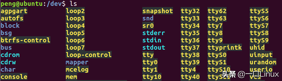 设备文件一般存放在 /dev/ 目录下,文件名为黄色,如下: