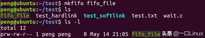 管道文件主要用于进程间通信,使用 ls -l 命令查看,第一个字符为 "p"(pipe)。可以使用 mkfifo 命令来创建一个管道文件: