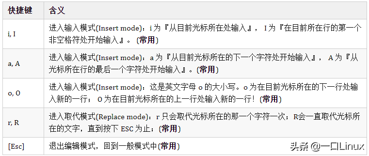 i 切换到输入模式,以输入字符。x 删除当前光标所在处的字符。: 切换到底线命令模式,以在最底一行输入命令。